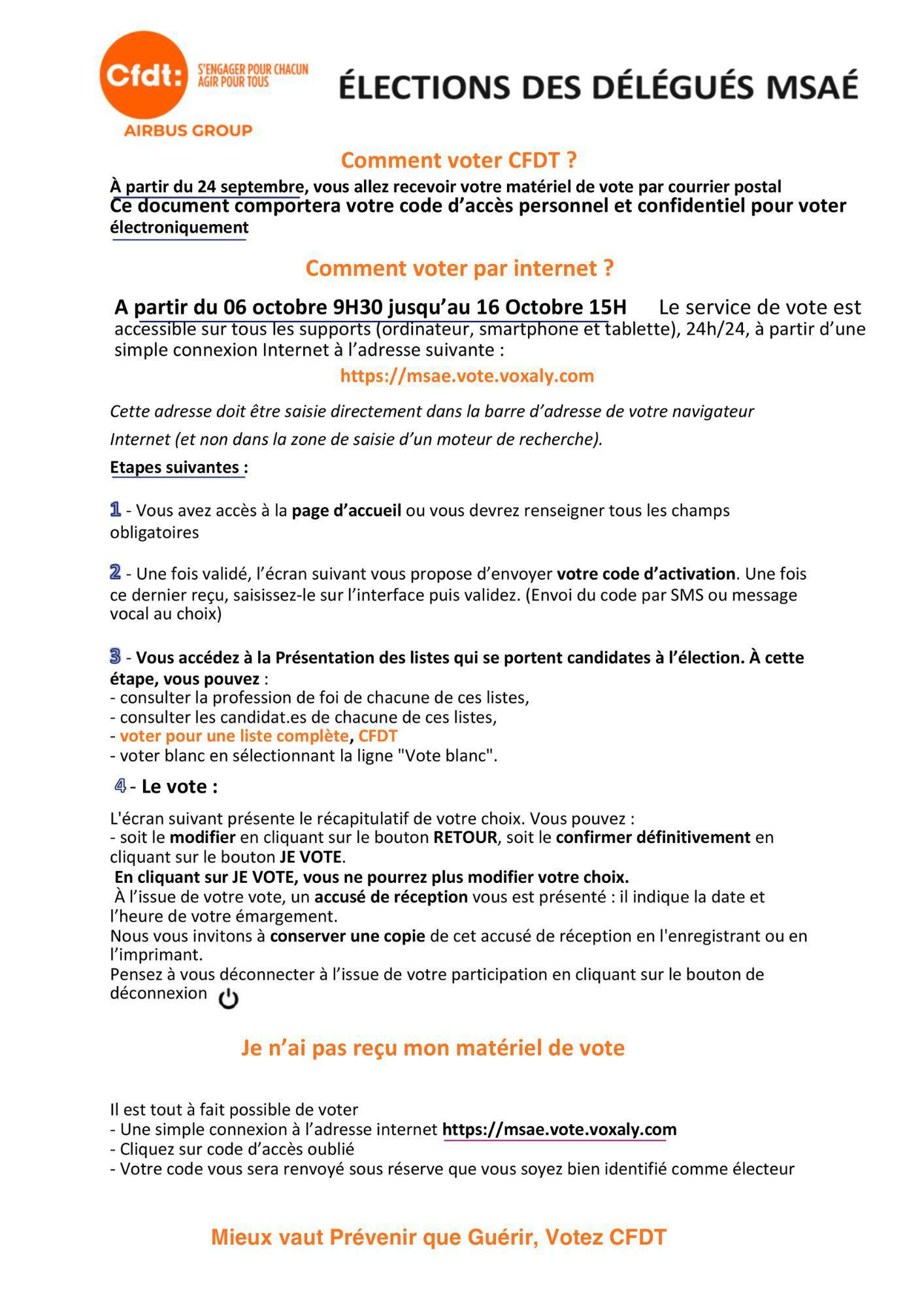 Je vous renvoie notre profession de foi, la liste des candidats CFDT ainsi que la procédure à suivre pour voter.