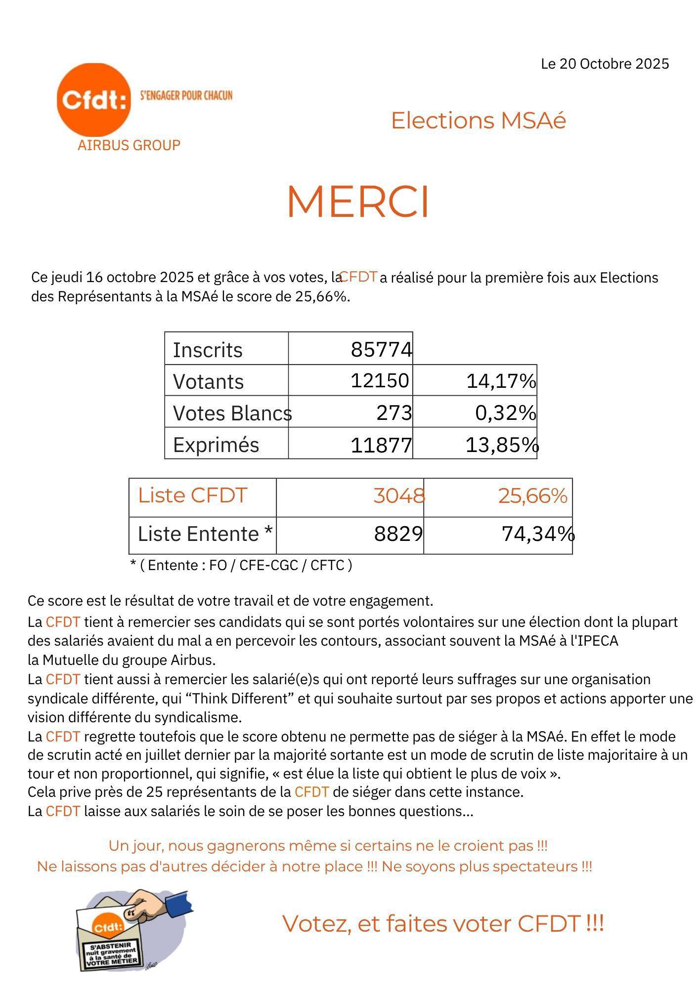 La CFDT remercie chaque salariée et salarié qui a apporté sa voix et qui à permis d'obtenir un résultat de plus de 25%.