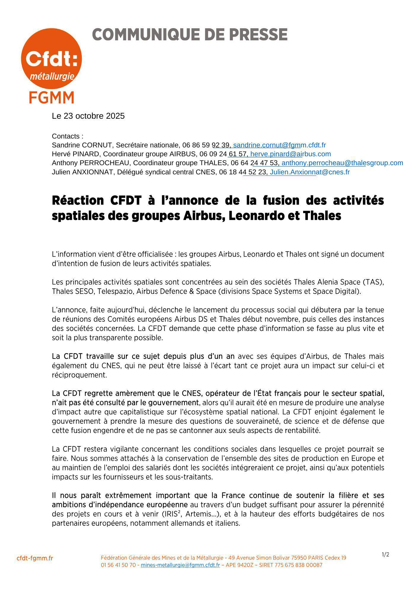 2025-10-23 Réaction CFDT à l'annonce de la Fusion spatial Airbus Thales Leonardo
