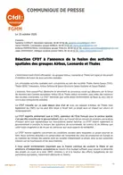 Réaction CFDT à l'annonce de la fusion des activités spatiales des groupes Airbus, Leonardo et Thales