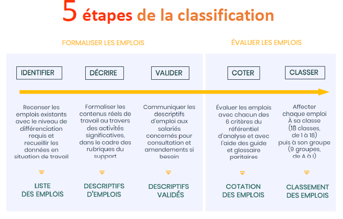 La classification passe par cinq étapes distinctes, décrites dans le guide pédagogique paritaire validé par la partie patronale et les organisations syndicales signataires de la convention collective.