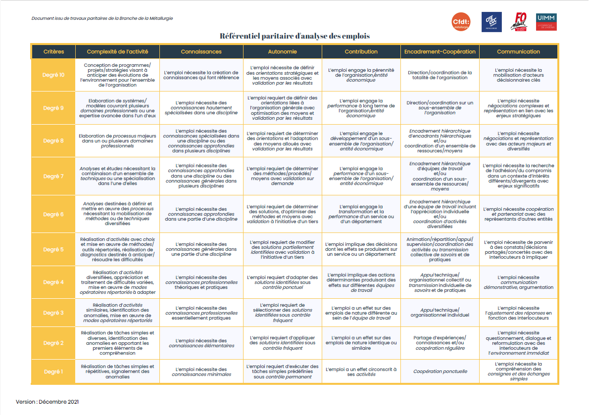 La cotation de l’emploi est réalisée à l’aide d’un référentiel d’analyse composé de 6 critères classants, chacun étant décliné en 10 degrés. Les critères sont indépendants les uns des autres et aucune pondération ne donne plus d’importance à l’un ou à l’autre.